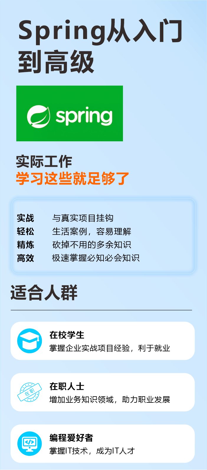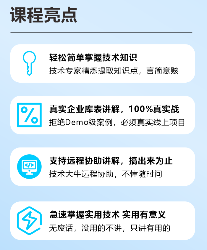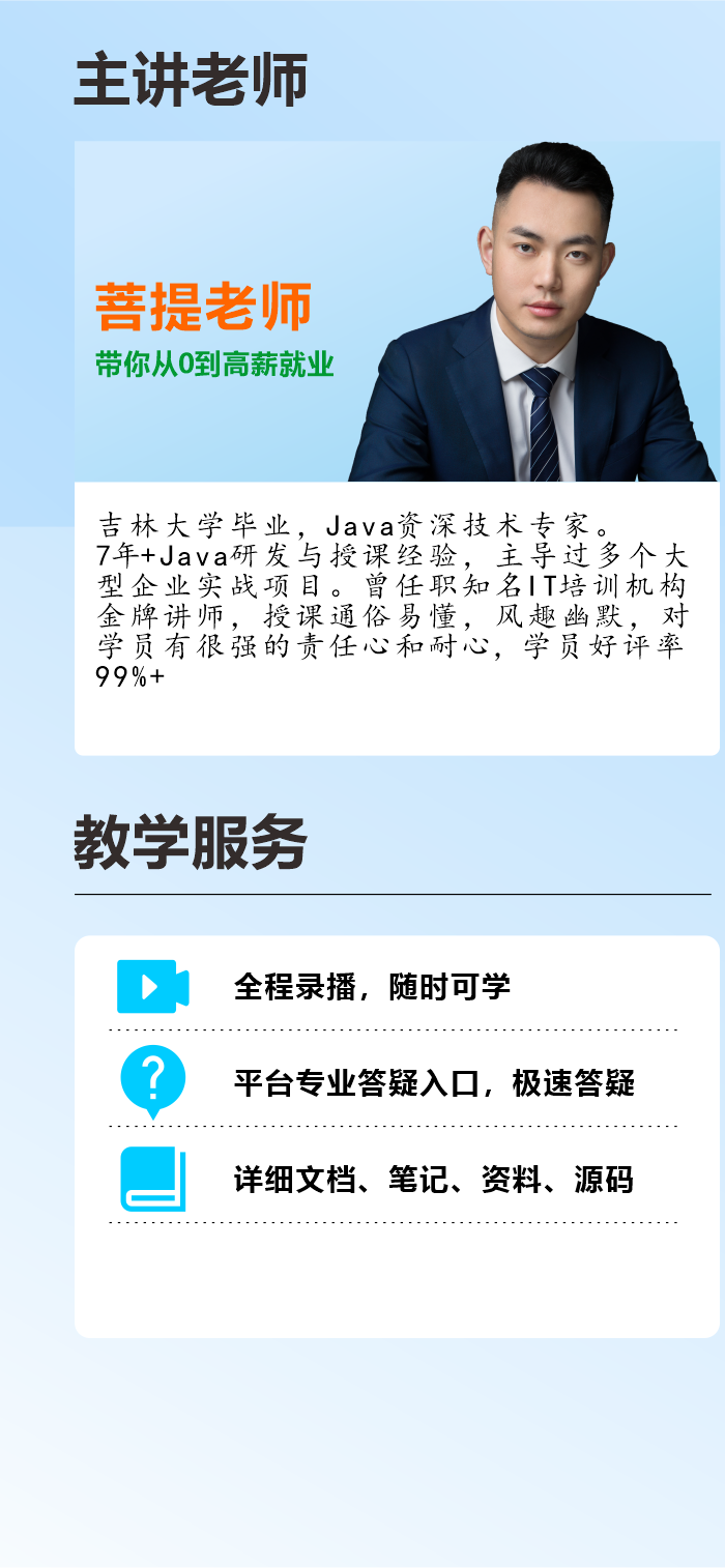 Spring是整个Java课程中最重要的课程之一,跟SpringMVC一样重要!IOC控制反转核心原理与ApplicationContext接口、DI依赖注入核心原理和正确使用方式、和循环依赖问题讲解、创建Bean的几种方式和底层原理、20+个常用注解、事务相关面试、AOP切面编程以及底层原理。