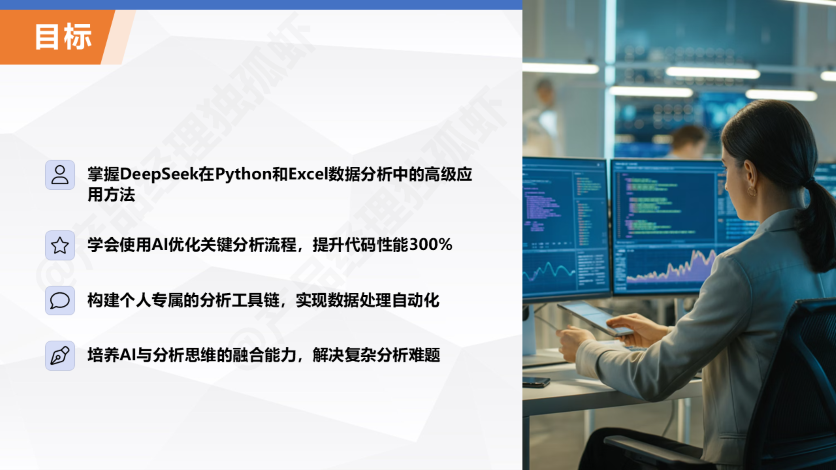 这不仅是一门技能培训,更是数据分析效率的全面升级。通过DeepSeek的强大代码理解和生成能力,你将从繁重的代码编写和公式构建工作中解放出来,将更多精力投入到真正的数据思考和洞察发现中,让你的分析价值最大化,成为团队中不可替代的效率专家。