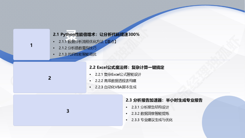 区别于市面上理论化的代码优化课程,我们提供的是经过实战验证的完整方法论:基于8万+真实数据分析项目提炼的"Python分析代码三段式优化法",独创的"Excel公式构建金字塔",以及面向决策者的"数据洞察三层递进法",覆盖数据分析师日常90%的代码和公式应用场景。每节课遵循"理论讲解+案例演示+实战练习"的高效学习结构,确保你能快速掌握并应用。