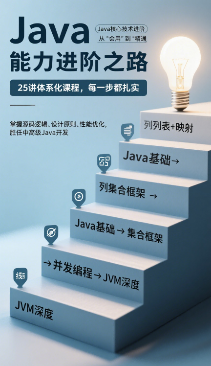 课程共 25 讲,全面覆盖 Java 开发与面试的核心领域,可分为四大模块: