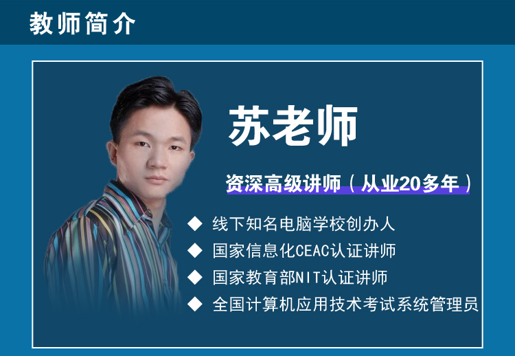 从事电脑教育二十多年,线下学员2W+人,线上学员超10W+。精通办公自动化及平面设计教学!具有较强工作实战经验! 1.线下知名电脑学校创办人 2.国家信息化CEAC认证讲师 3.国家教育部NIT认证讲师 4.全国计算机应用技术考试系统管理员。