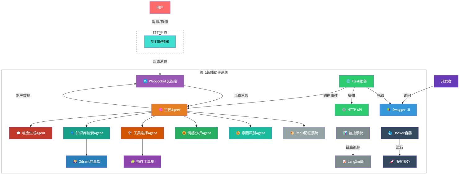 腾飞智能助手开源版是基于钉钉平台的AI助手,集成了大型语言模型、知识库、记忆系统和多种工具能力,提供智能问答、任务处理和信息检索服务。