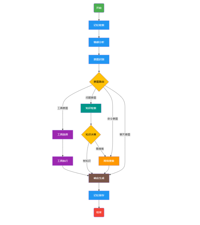 问题: 根据对用户意图识别(纯知识性问题例如:LangGraph快速入门、MySQL安装教程),先从知识库(Qdrant)进行相似度检索,如果检索到结果,则利用 DeepSeek-V3 大语言模型将将检索结果、用户情绪、结合上下文信息(对话记忆)进行 RAG 增强的自然对话响应;否则调用搜索工具进行实时查询,利用 DeepSeek-V3 大语言模型将实时查询数据、用户情绪、结合上下文信息(对话记忆)进行 RAG 增强的自然对话响应。