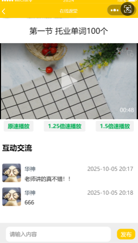 课堂轮播图、课堂分类、课程小节、课程视频、购买课程功能、收藏课程、分享课程、分享到朋友圈功能、课程目录、课程介绍、设置免费小节观看学习、倍速播放课程、互动交流学习、最新授权登录、搜索课程、课程二级分类。web后台管理功能。