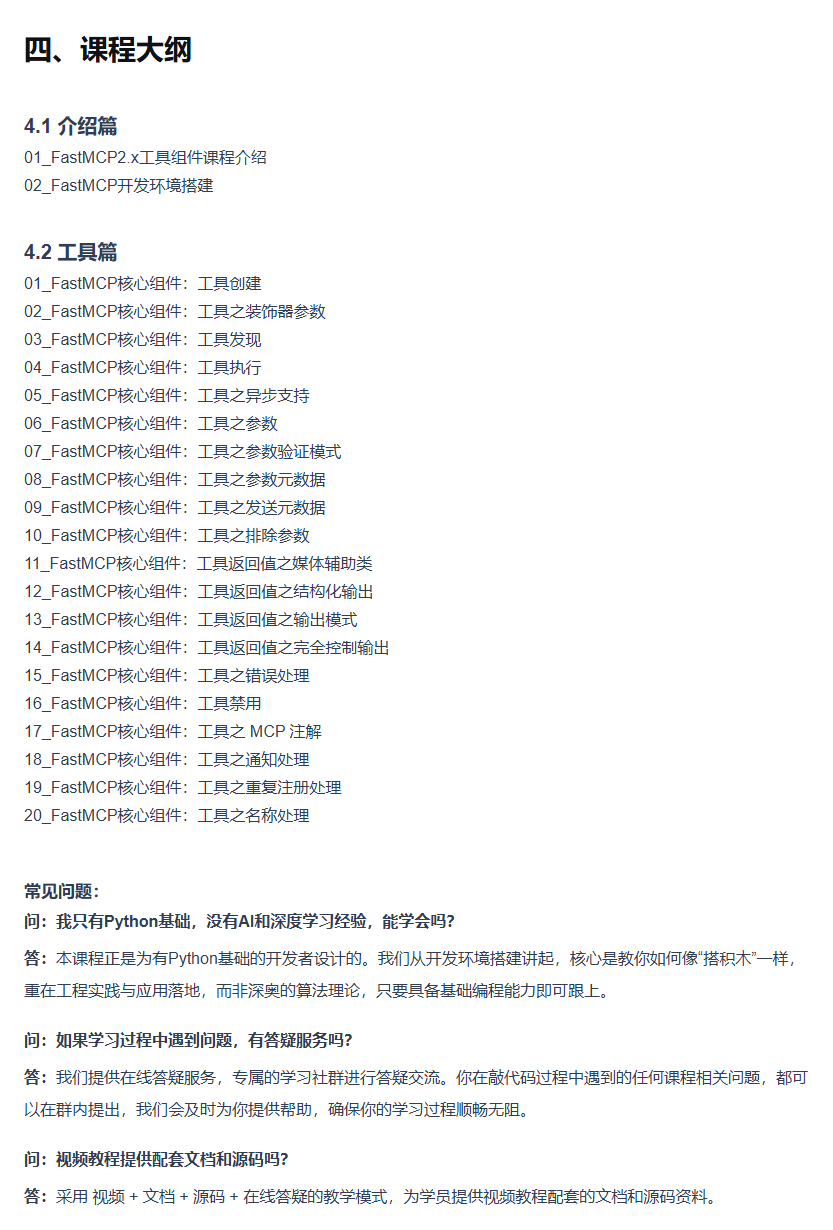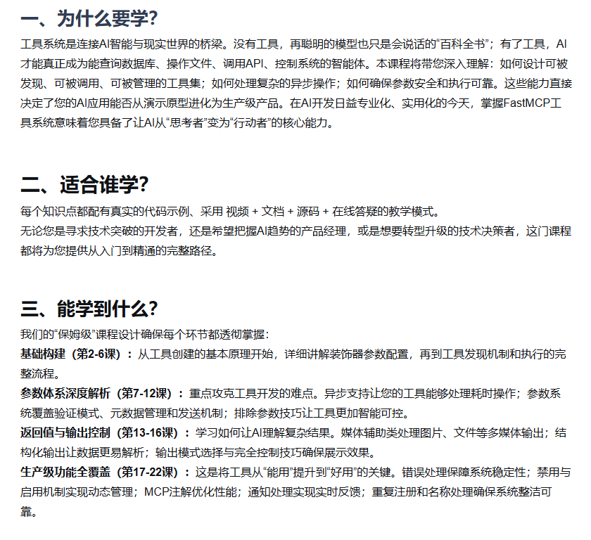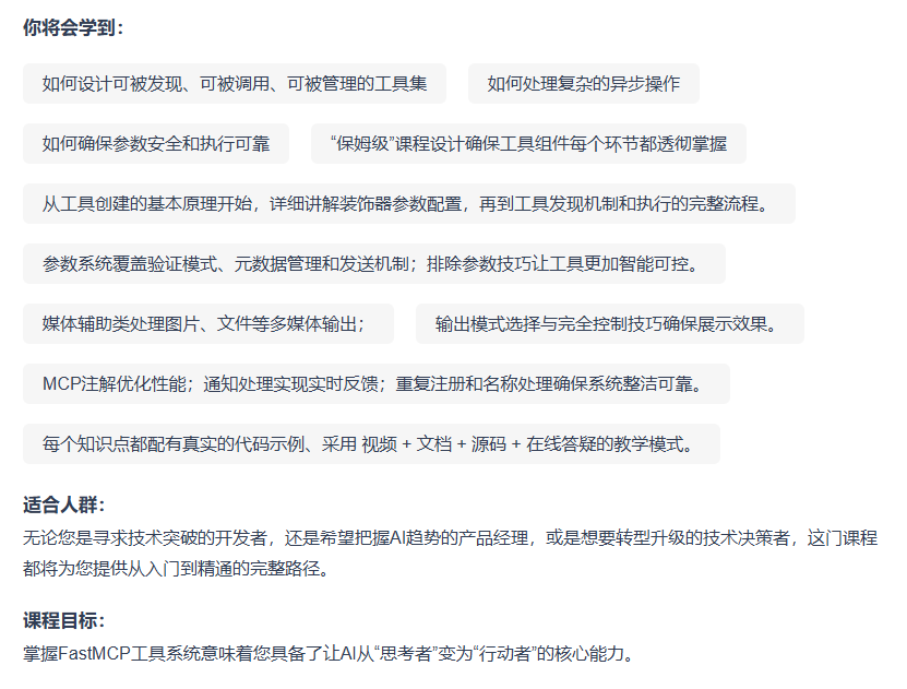本课程旨在系统教授FastMCP工具组件的开发与应用,帮助开发者如何设计可被发现、可被调用、可被管理的工具集。工具组件是AI连接现实世界的核心,通过工具集设计、异步处理和安全参数管理等能力,使AI从被动应答变为主动执行。课程采用“保姆级”教学,涵盖工具创建、参数体系、返回值控制和生产级功能四大模块,适合开发者、产品经理和技术决策者学习。课程内容从基础到进阶,包括装饰器配置、异步支持、参数验证、结构化输出、错误处理等关键技能,最终使学员掌握将AI应用从原型提升为可靠产品的完整路径。