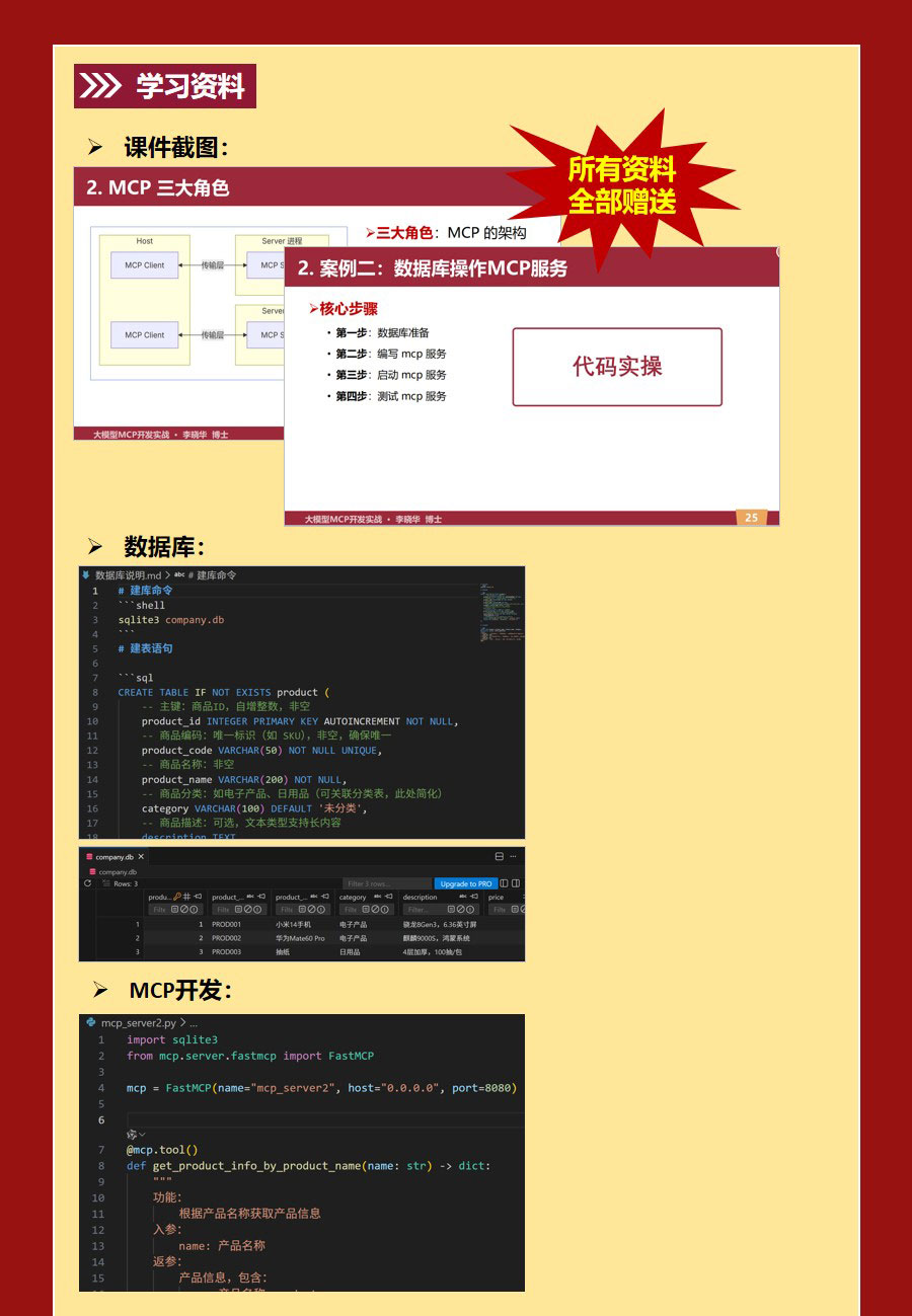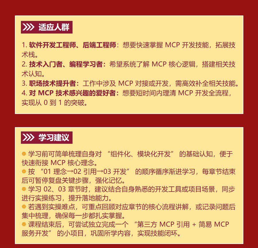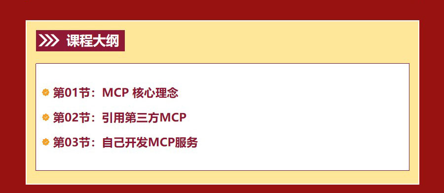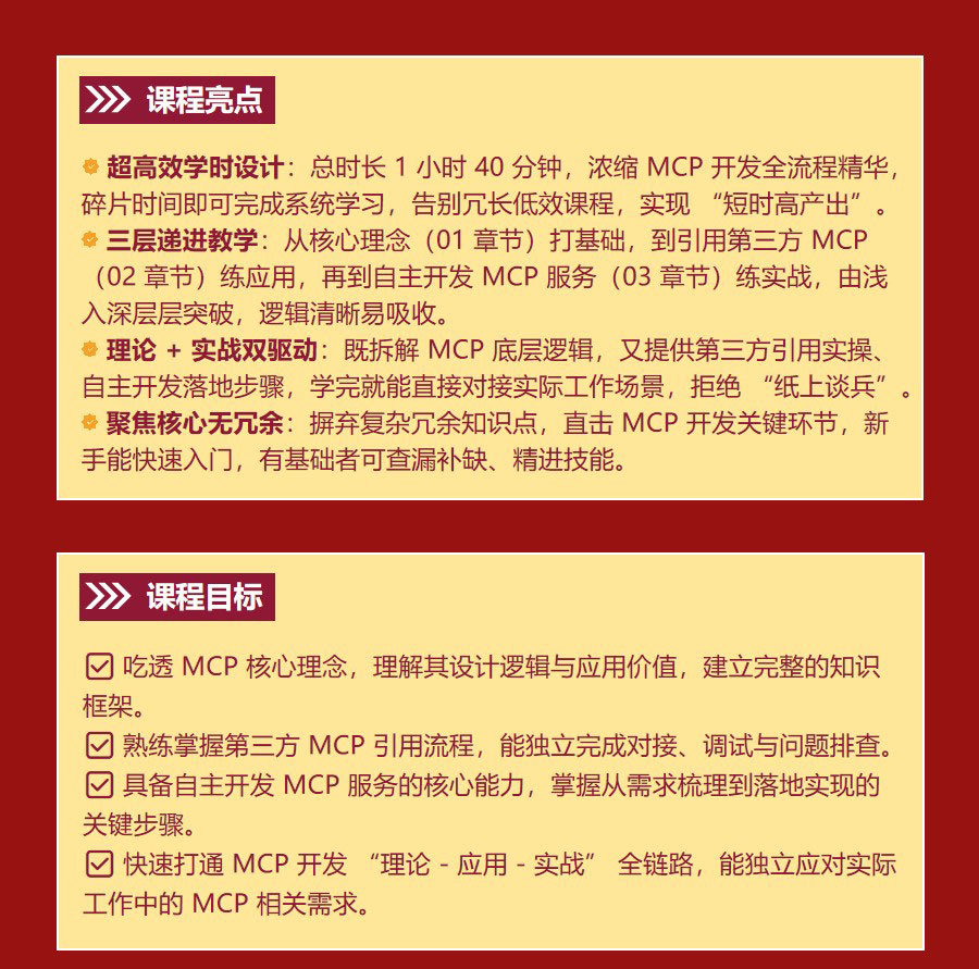 快速打通 MCP 开发 “理论 - 应用 - 实战” 全链路,能独立应对实际工作中的 MCP 相关需求。