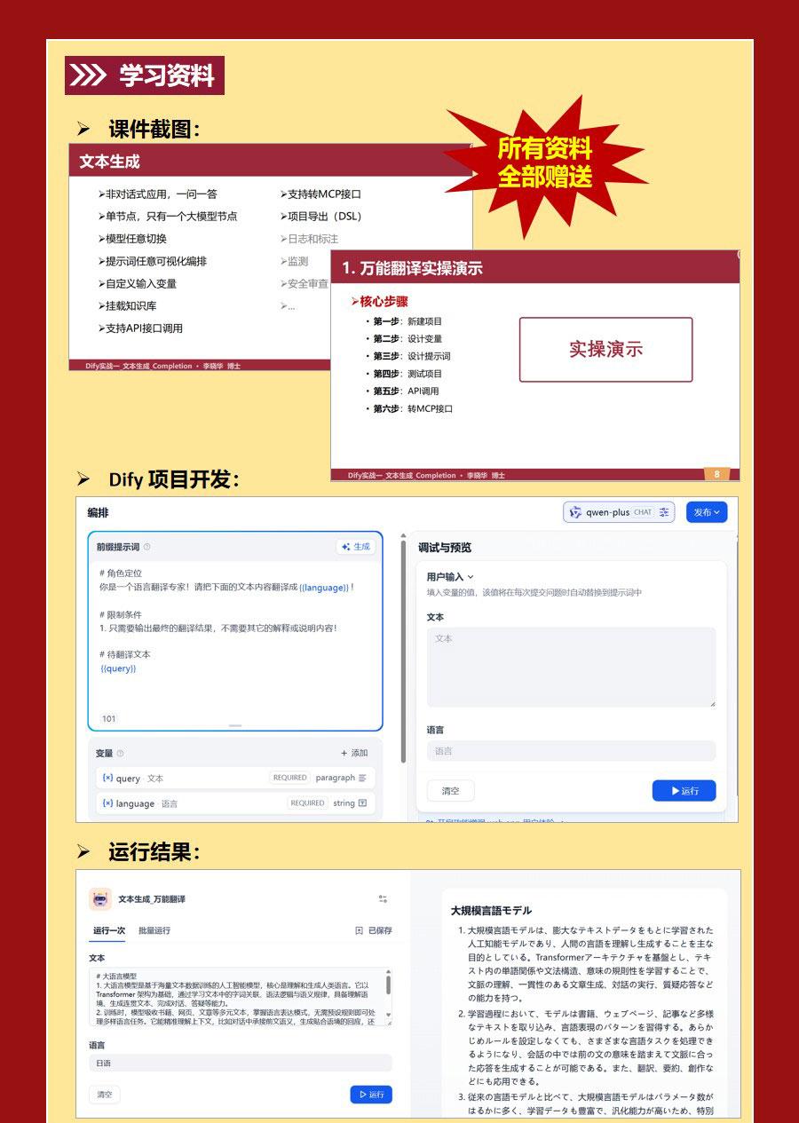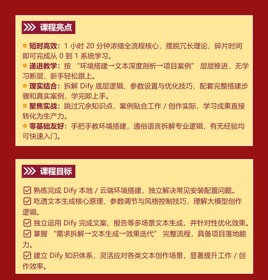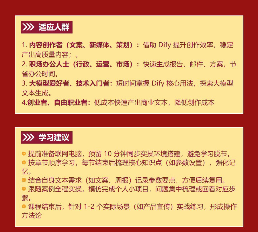 熟练完成 Dify 本地 / 云端环境搭建,吃透文本生成核心原理、参数调节与风格控制技巧,理解大模型创作逻辑