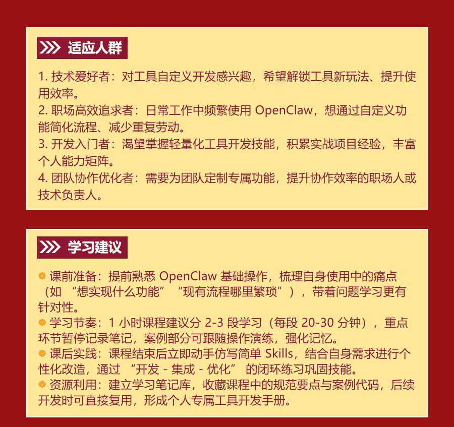 全流程闭环教学,学完即能用:从工具基础认知,到独立开发符合标准的 Skills,再到成功集成上线,三步形成完整学习闭环,无需额外补充知识,课后即可动手实践